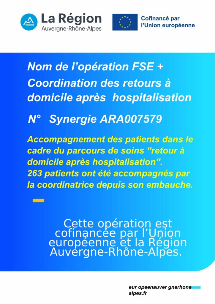 Grâce au financement du FSE+, de la Région Auvergne Rhône-Alpes et de l’Union européenne, la CPTS met en place un dispositif innovant pour améliorer le retour à domicile des patients après hospitalisation.